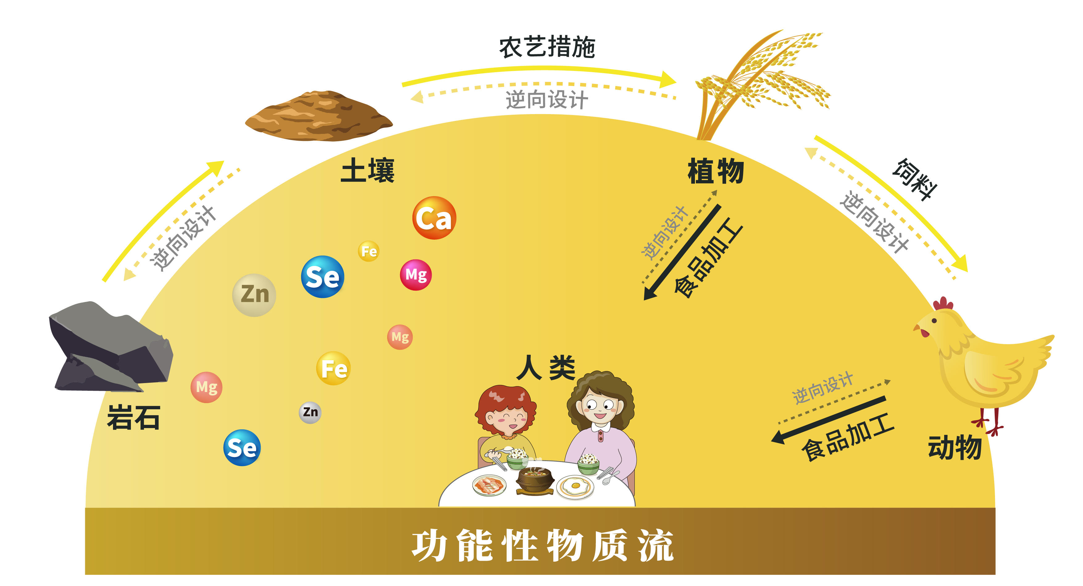 功能農業是2008年由中國科學家率先提出并付諸實踐的農業發展新方向,2016年在《功能農業》一書中首次將其進行定義,2019年中科院香山科學會議再次將其予以修正,是指在天然富含有益成分的土壤、生境中生長或通過生物營養強化技術及其他生物技術培育,實現農副產品中一種或多種有益健康成分(如:礦物質、生物化合物)基于人類健康需求做出標準化優化的生產實踐。功能農業重點探索“巖石-土壤-植物-動物-食品-人體”這一鏈條中功能性物質流的傳輸規律與調控技術。