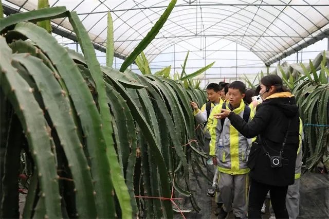 在參觀現代農業環節,同學們在講解員的帶領下,分別參觀了植物怡家館、航天育種示范基地、良種繁育基地、臺灣紅心火龍果基地、臺灣香水檸檬基地。通過邊看邊聽邊問,同學們初步了解了航天農業、現代農業、有機農業、富硒農業的概念。