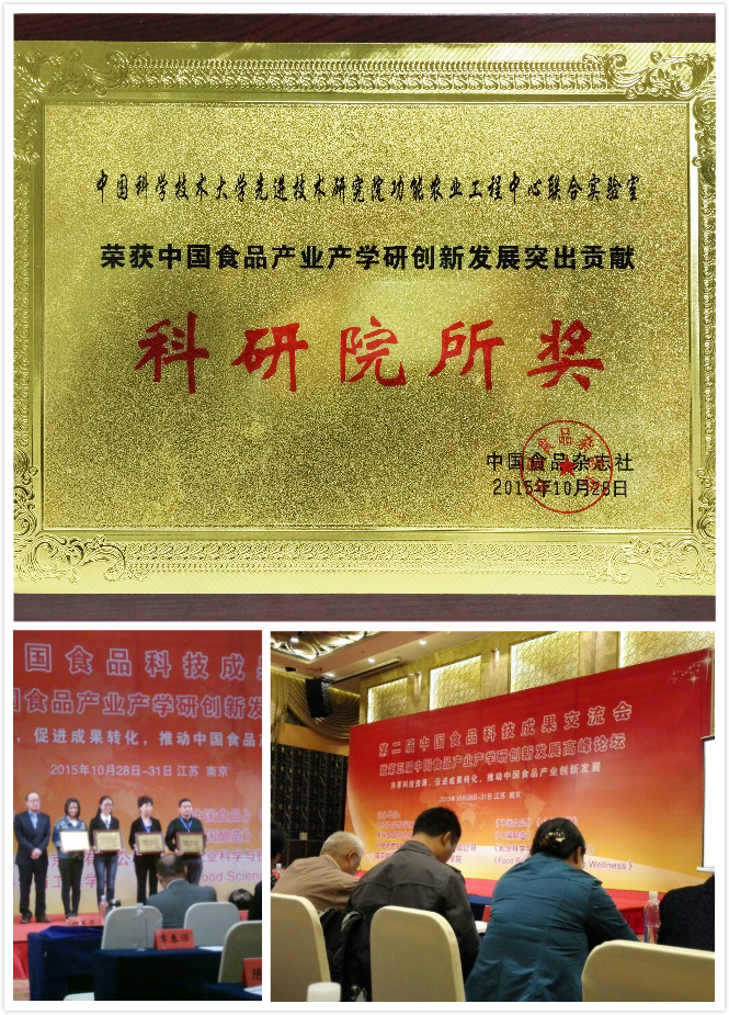 2015年10月28日-31日,由北京食品科學(xué)研究院和中國食品雜志社、中糖新世紀(jì)國際會(huì)展(北京)有限公司、南京財(cái)經(jīng)大學(xué)食品科學(xué)與工程學(xué)院聯(lián)合主辦的“第二屆中國食品科技成果交流會(huì)暨第五屆中國食品產(chǎn)業(yè)產(chǎn)學(xué)研創(chuàng)新發(fā)展高峰論壇”在南京國際博覽中心舉辦。會(huì)上揭曉了“中國食品產(chǎn)業(yè)產(chǎn)學(xué)研創(chuàng)新發(fā)展系列獎(jiǎng)項(xiàng)”并舉辦了隆重的頒獎(jiǎng)典禮。中國科學(xué)技術(shù)大學(xué)先進(jìn)技術(shù)研究院功能農(nóng)業(yè)工程中心聯(lián)合實(shí)驗(yàn)室榮獲“中國食品產(chǎn)業(yè)產(chǎn)學(xué)研創(chuàng)新發(fā)展突出貢獻(xiàn)科研院所獎(jiǎng)”。