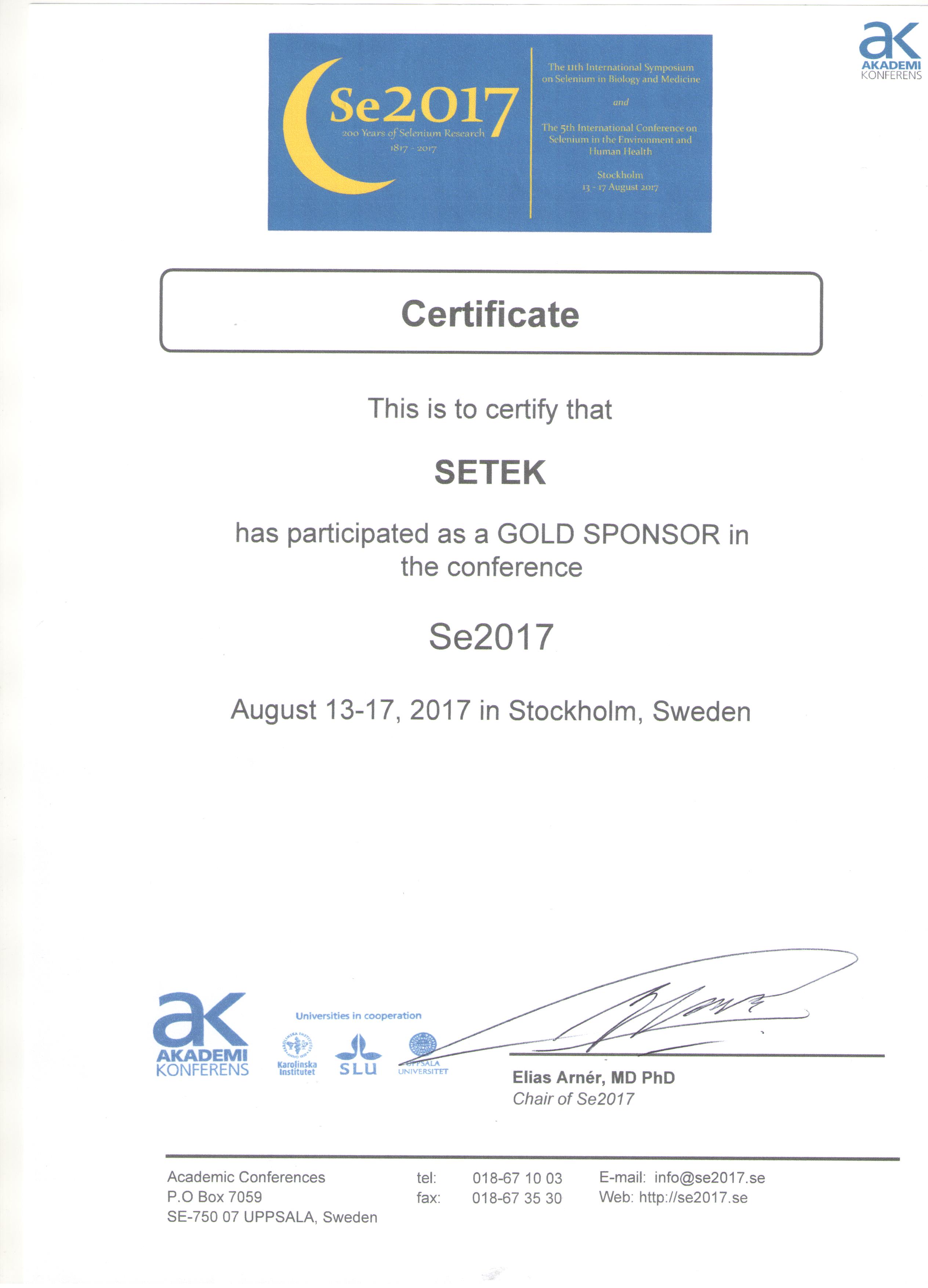 2017年8月13日-17日,“第五屆國際硒與環境和人體健康大會”與“第十一屆硒與生物學和醫學國際研討會”在瑞典首都斯德哥爾摩舉行,以紀念硒元素發現200周年。本次會議由國際硒研究學會、瑞典卡洛琳斯卡醫學院與中國科學技術大學聯合主辦,瑞典卡洛琳斯卡醫學院Elias Arner教授任主席,尹雪斌博士為共同主席。