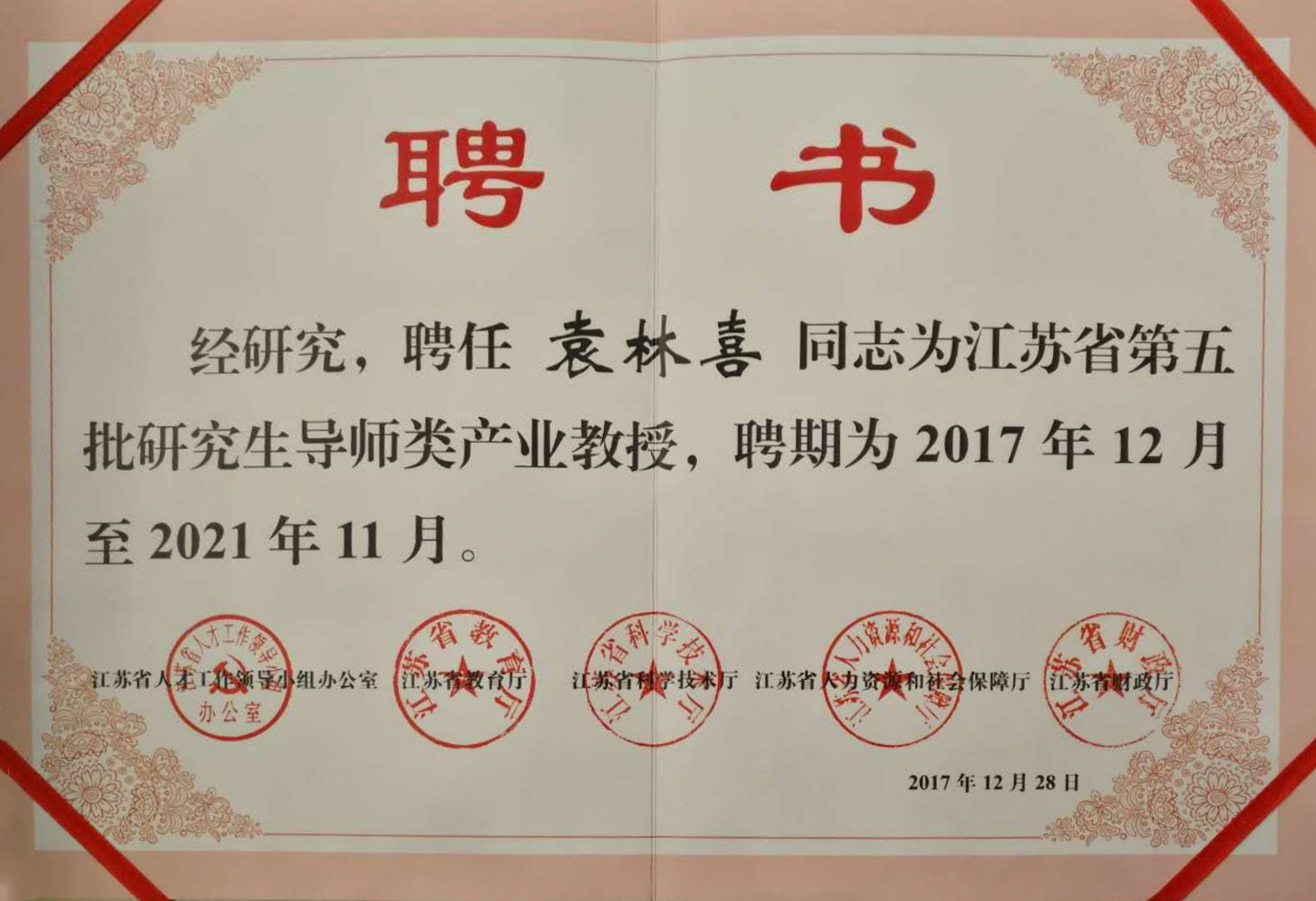 江蘇省第五批產業教授中研究生導師類產業教授共205名,袁林喜博士為其中之一。從2010年開始,江蘇在全國首先開展產業教授選聘,由省人才辦、省教育廳、省科技廳、省人社廳、省財政廳等部門聯合組織實施。產業教授選聘重點對象為科技型企業家及企業技術精英。主要目的是為大力實施人才強省戰略,加快創新型省份建設,更好地推進產學研合作,探索高校與企業聯合培養人才的新機制,選聘一批科技企業家,到具有碩士及以上學位授予權的普通本科高校擔任江蘇產業教授。