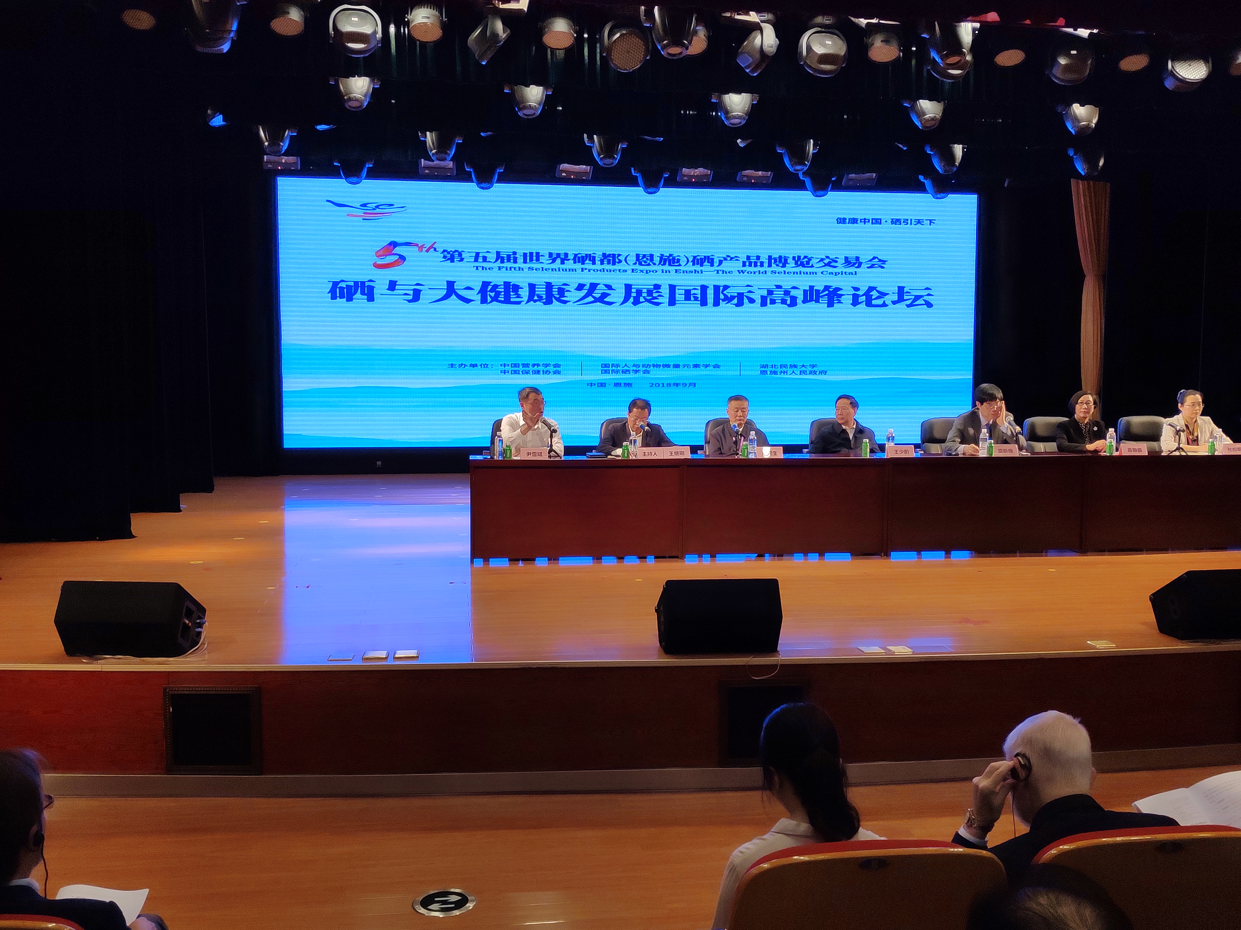 國際硒學會秘書長尹雪斌教授(左一)在“硒與大健康發展國際高峰論壇”開幕式上致辭