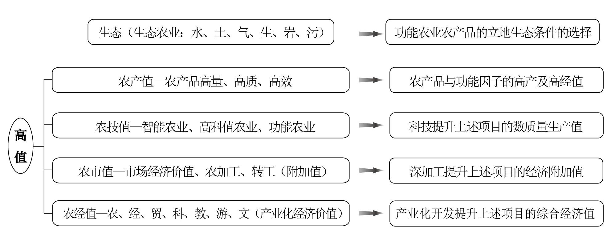 生態(tài)即指生態(tài)農(nóng)業(yè),包括水、土、氣、生、巖、污等部分。高值包括農(nóng)產(chǎn)值、農(nóng)技值、農(nóng)市值、農(nóng)經(jīng)值。其中,農(nóng)產(chǎn)值是指農(nóng)產(chǎn)品高量、高質(zhì)、高效,簡稱“農(nóng)–產(chǎn)”。農(nóng)技值是指功能農(nóng)業(yè)、智能農(nóng)業(yè)、高科值農(nóng)業(yè),簡稱“農(nóng)技–產(chǎn)”。農(nóng)市值是指市場經(jīng)濟(jì)價(jià)值(農(nóng)二產(chǎn))、農(nóng)加工、轉(zhuǎn)工,簡稱“附加值”。農(nóng)經(jīng)值是指產(chǎn)業(yè)化經(jīng)濟(jì)價(jià)值(農(nóng)三產(chǎn)),包括農(nóng)、經(jīng)、貿(mào)、科、教、游、文等內(nèi)容,如功能農(nóng)業(yè)養(yǎng)生園、牛博園、鹽博園、體驗(yàn)農(nóng)業(yè)、農(nóng)業(yè)公園等(圖2)。