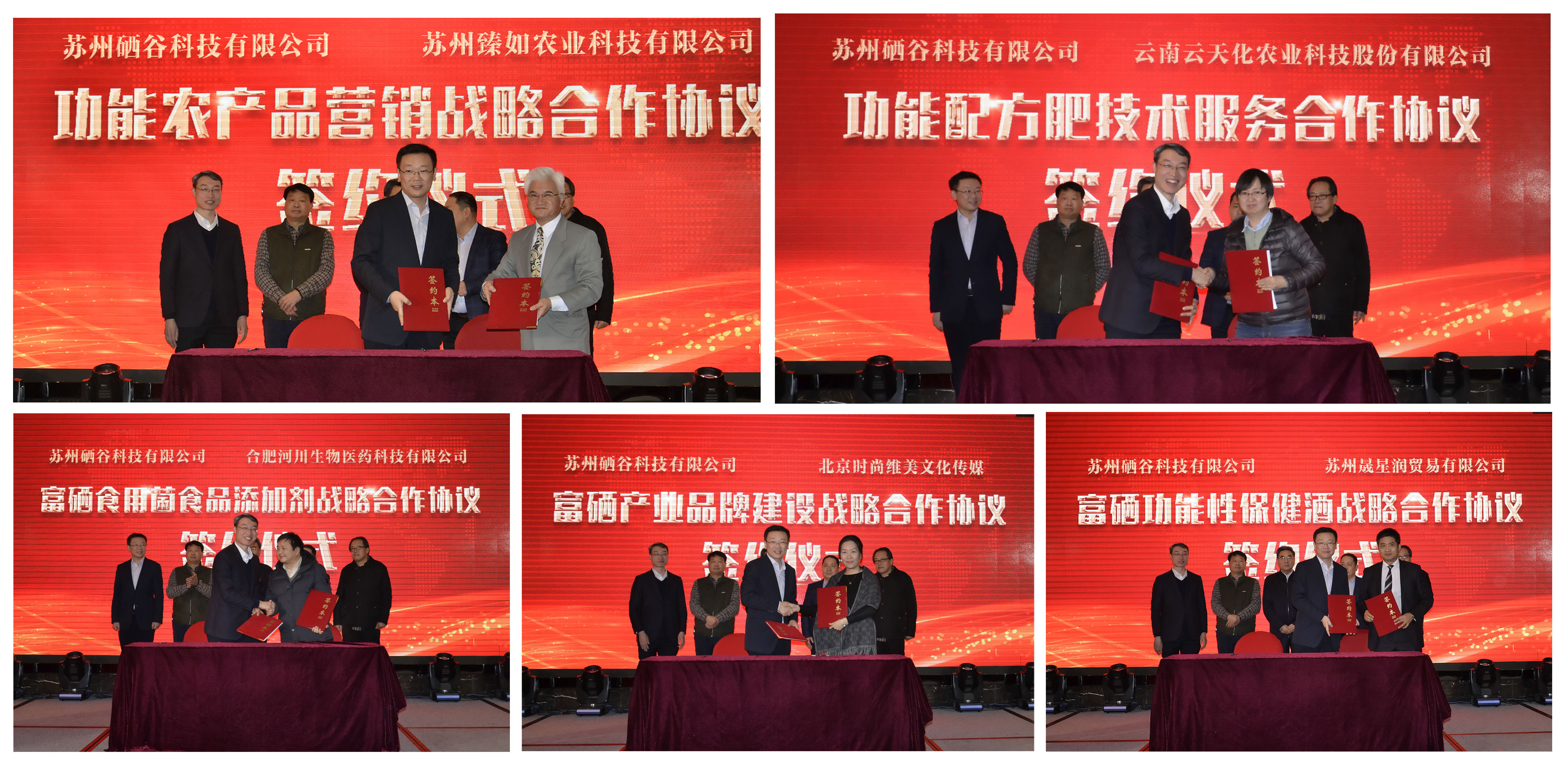 活動期間,舉行了蘇州硒谷科技有限公司與蘇州臻如農(nóng)業(yè)科技有限公司簽署“功能農(nóng)產(chǎn)品營銷戰(zhàn)略合作協(xié)議”儀式;硒谷科技與云南云天化農(nóng)業(yè)科技股份有限公司簽署“功能配方肥技術服務合作協(xié)議”儀式;硒谷科技與合肥河川生物醫(yī)藥科技有限公司簽署“富硒食用菌食品添加劑戰(zhàn)略合作協(xié)議”儀式;硒谷科技有限公司與北京時尚維美文化傳媒簽署“富硒產(chǎn)業(yè)營銷戰(zhàn)略合作協(xié)議”儀式;硒谷科技與蘇州晟星潤貿(mào)易有限公司簽署“富硒保健酒戰(zhàn)略合作協(xié)議”儀式。通過不斷團聚全國各領域功能農(nóng)業(yè)發(fā)展力量,硒谷科技功能農(nóng)業(yè)全產(chǎn)業(yè)鏈服務功能得到進一步完善。
